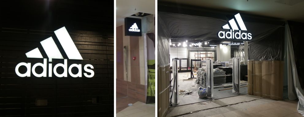 Ребрендинг Адидас в Гранд-КаньонеЛоготипы склеены из оргстекла и ПВХ-пластика. Подсветка - светодиоды. |